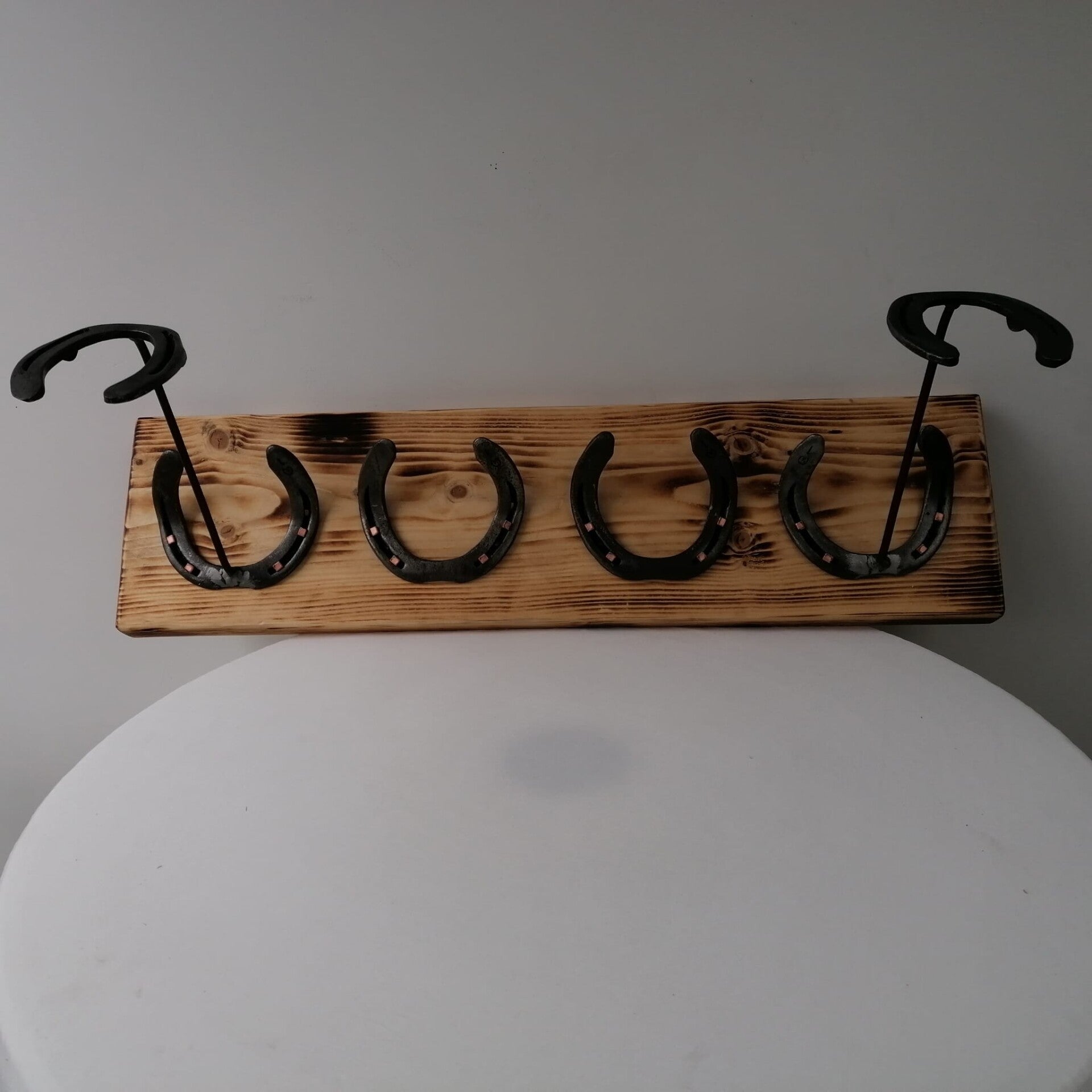Deze unieke kapstok, volledig handgemaakt in ons eigen ateljee, combineert gerecycleerde hoefijzers met een robuust houten plank ( 3 cm dik ), afgewerkt met een prachtige matte vernislaag. Met acht stevige haken en twee cowboyhoedsteunen biedt hij volop ruimte voor het ophangen van jassen, hoeden en andere accessoires. De hoefijzers en het gebrande hout stralen een stoere, rustieke charme uit, perfect voor een authentieke landelijke stijl.